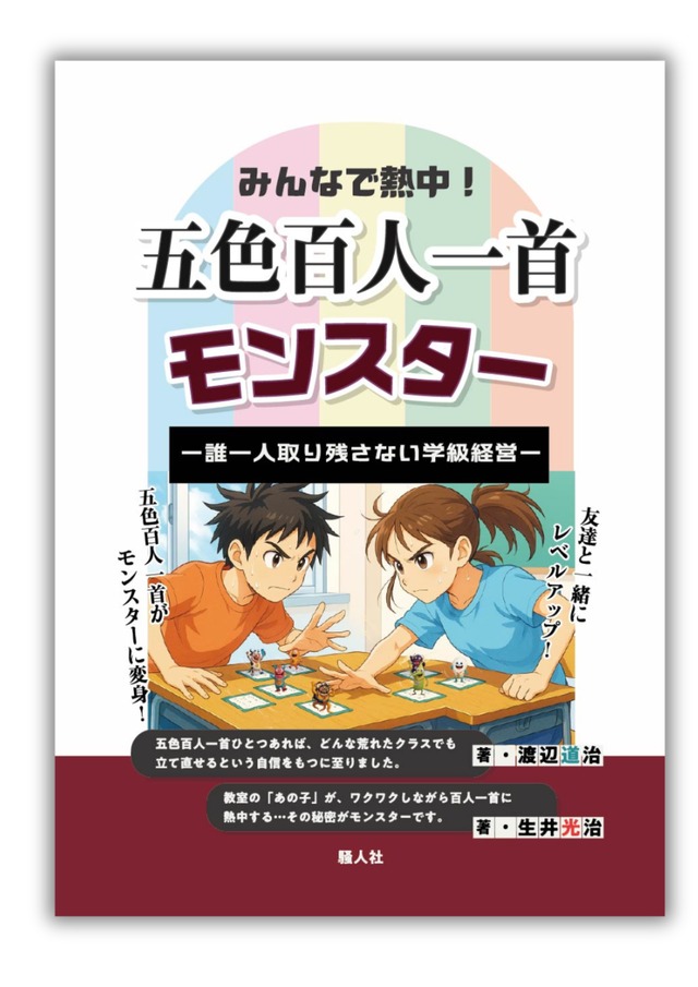 先行予約限定!! 送料無料! 12月21日(日)まで 12月24日頃より順次発送予定 年間学級通信1000号以上、どんなに荒れたクラスでも立て直し続けてきた渡辺道治先生。 学級経営の軸に10年間以上学級活動を実践してきた生井光治先生。 この2人の実践が化学反応を起こし、この世に生み落とされた100体の愛すべきモンスターたち。 巻頭(オールカラー) ◆五色百人一首モンスター <上の句と下の句の語呂合わせモンスター> QRから教室掲示用モンスターを印刷できます。 ◆TOSS教材五色百人一首 <五色百人一首協会HP・五色百人一首の特徴・五色百人一首で遊ぼう・五色百人一首の札の秘密> 第1章 五色百人一首で学級づくり 渡辺 道治 第2章 五色百人一首モンスター ×学級経営の実践紹介 生井 光治 第3章 五色百人一首鼎談 -子供の成長と五色百人一首- 渡辺道治×生井光治×師尾勇生(進行) ______________ A5判 単行本 教室掲示用モンスター100体 データ共有リンク/印刷可能 著・渡辺道治/生井光治 <向山洋一先生からのあとがき> 「五色百人一首モンスター」は間違いなく楽しい実践だ。 本書の渡辺道治氏・生井光治氏の実践家が、「百人一首の面白さを体験してから、モンスターの実践を行ってほしい。」と言っている。同感である。千年続くこの知的な「百人一首」という教材が、学校現場でさらに広まっていくことを願っている。 発 刊:株式会社騒人社 価 格:2200円(税込み) ISBN 9784 88290 1037 発刊日:2026年12月26日(金)